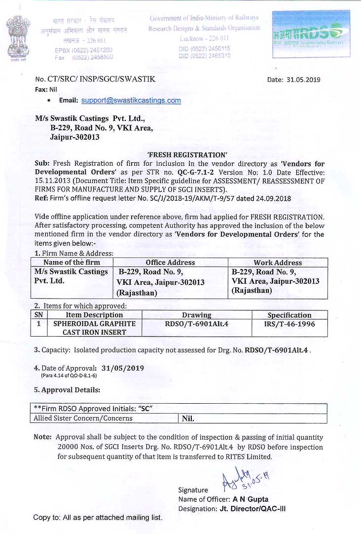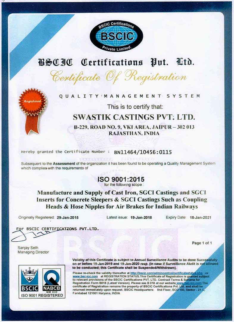 Company has a well established quality assurance programme to check process Parameters at each stage right from raw material inspection upto finished Component, SCPL endeavours to deliver consistent quality product. The company has ISO 9001:2015 accredition.
